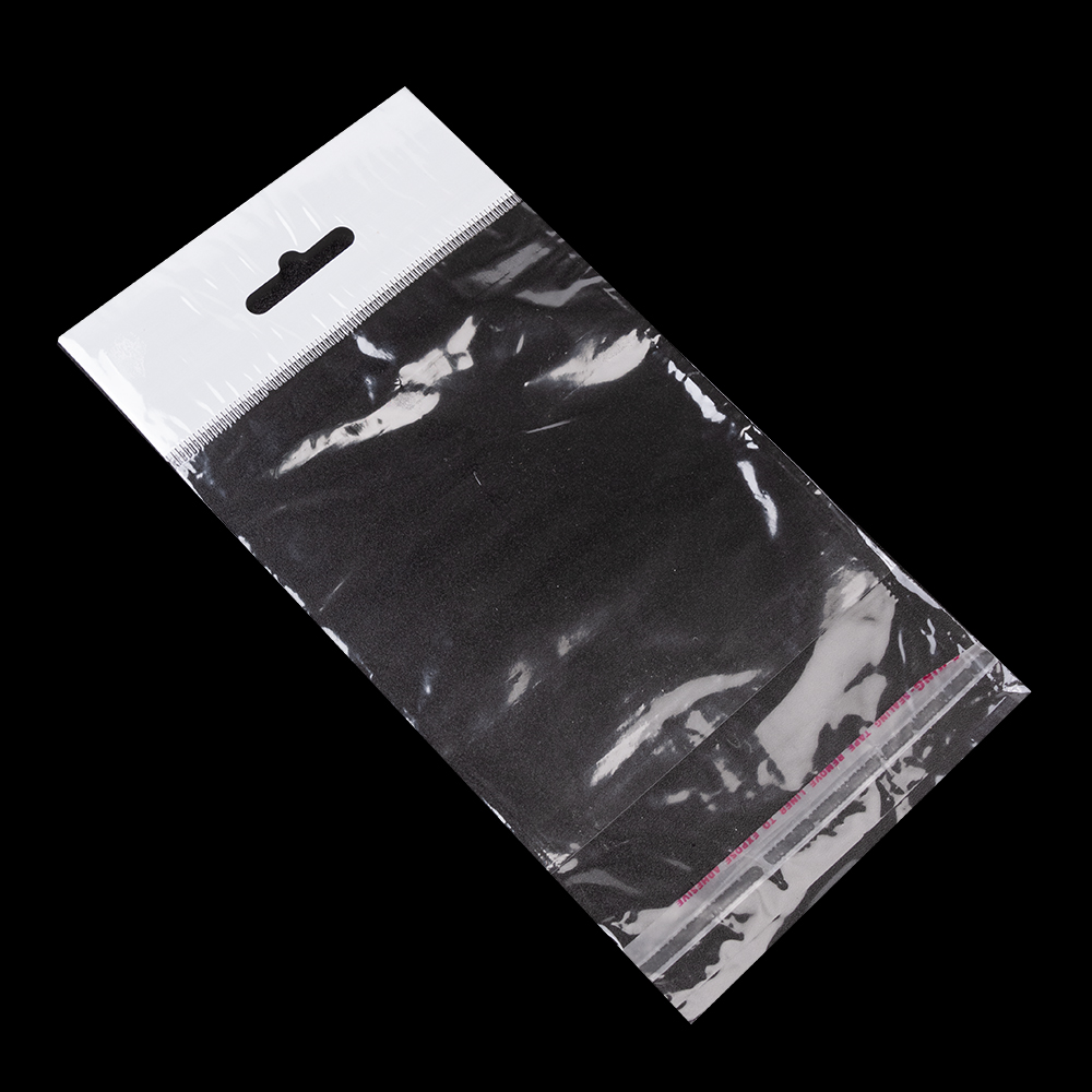 Прозрачный пакет с клейкой полоской и европодвесом.