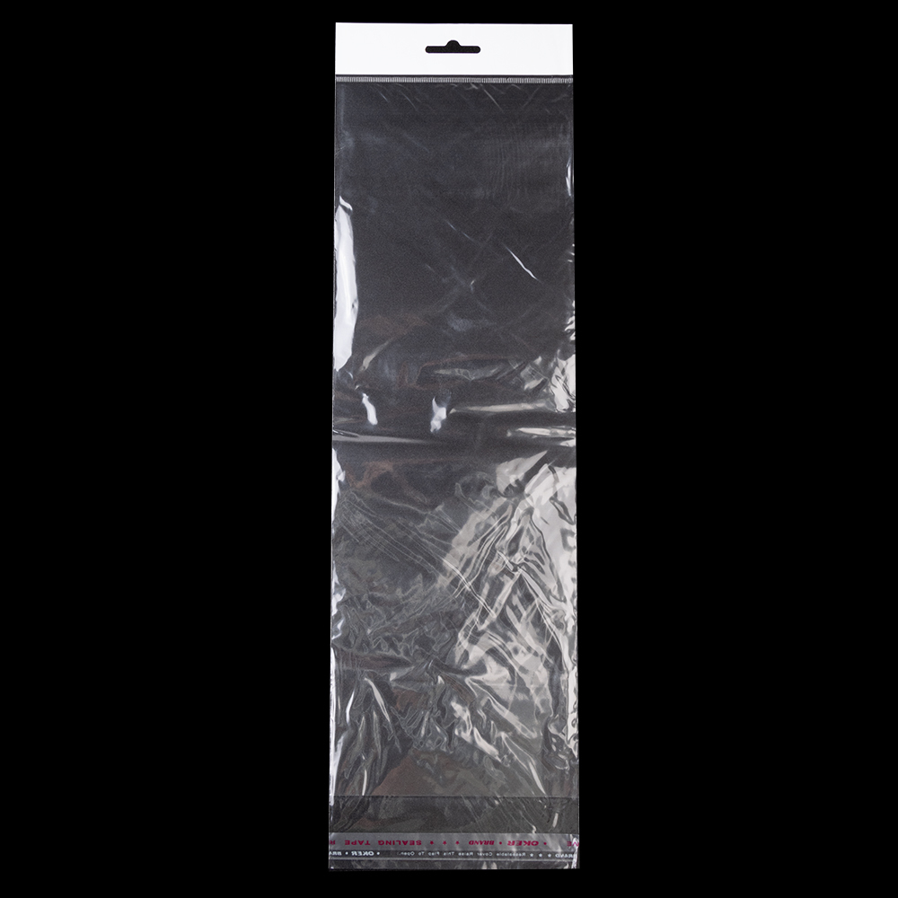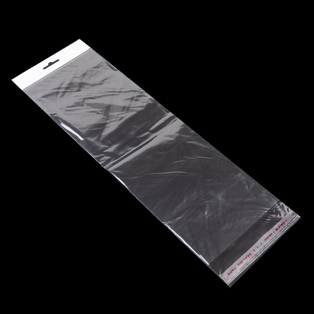 Прозрачный пакет с клейкой полоской и европодвесом.