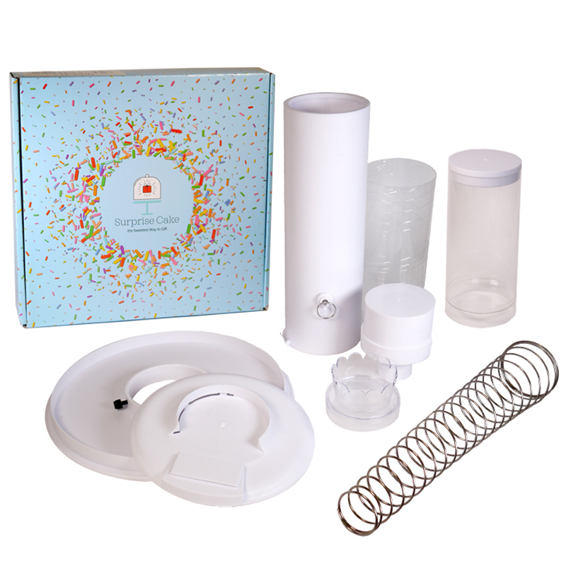 В комплекте: 1) Пластиковая труба с кольцом; 2) Пластиковый челнок; 3) Металлическая пружина;4) Пластиковая база; 5) Пластиковая тарелка с винтами (диаметр 26 см); 6) Пластиковая подарочная колба, в которую помещается подарок (высота – 17 см, диаметр – 7 см); 7) Пластиковая колба для извлечения середины торта. 8) Подставка для капкейка.