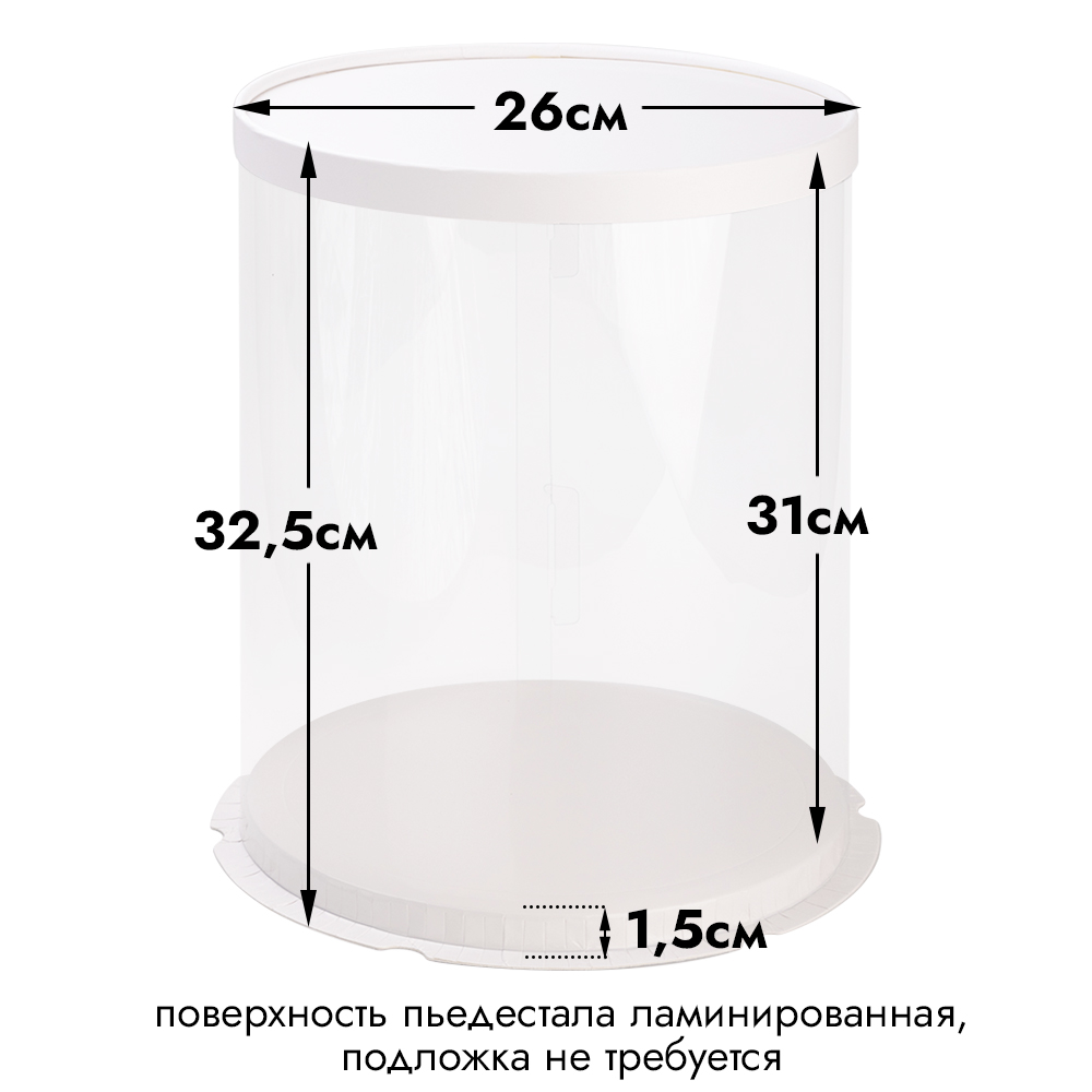 Поверхность пьедестала выполнена из ламинированного картона, используется в качестве подложки для торта. Для фиксации коробки используйте декоративную ленту.