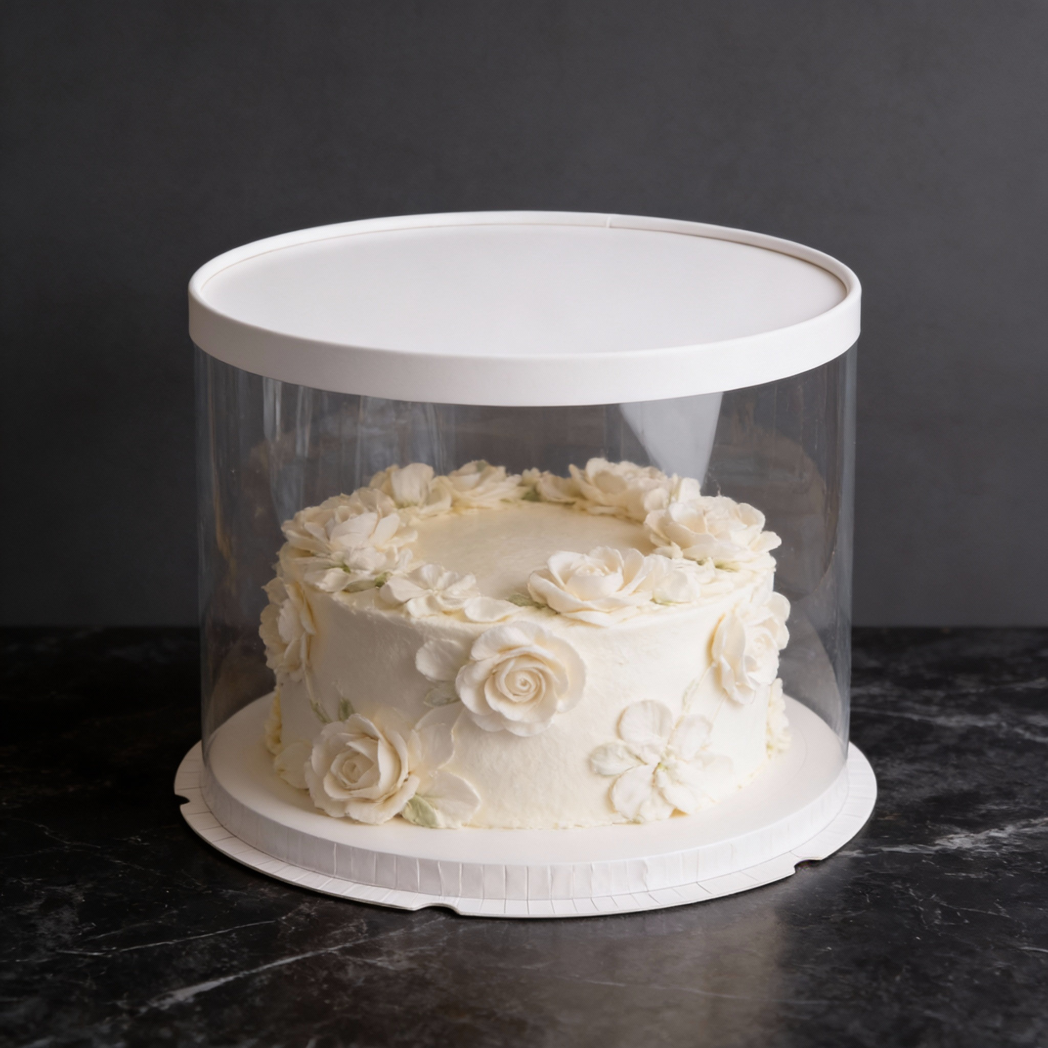Коробка для хранения и транспортировки тортов с прозрачными стенками из плотного пластика.
