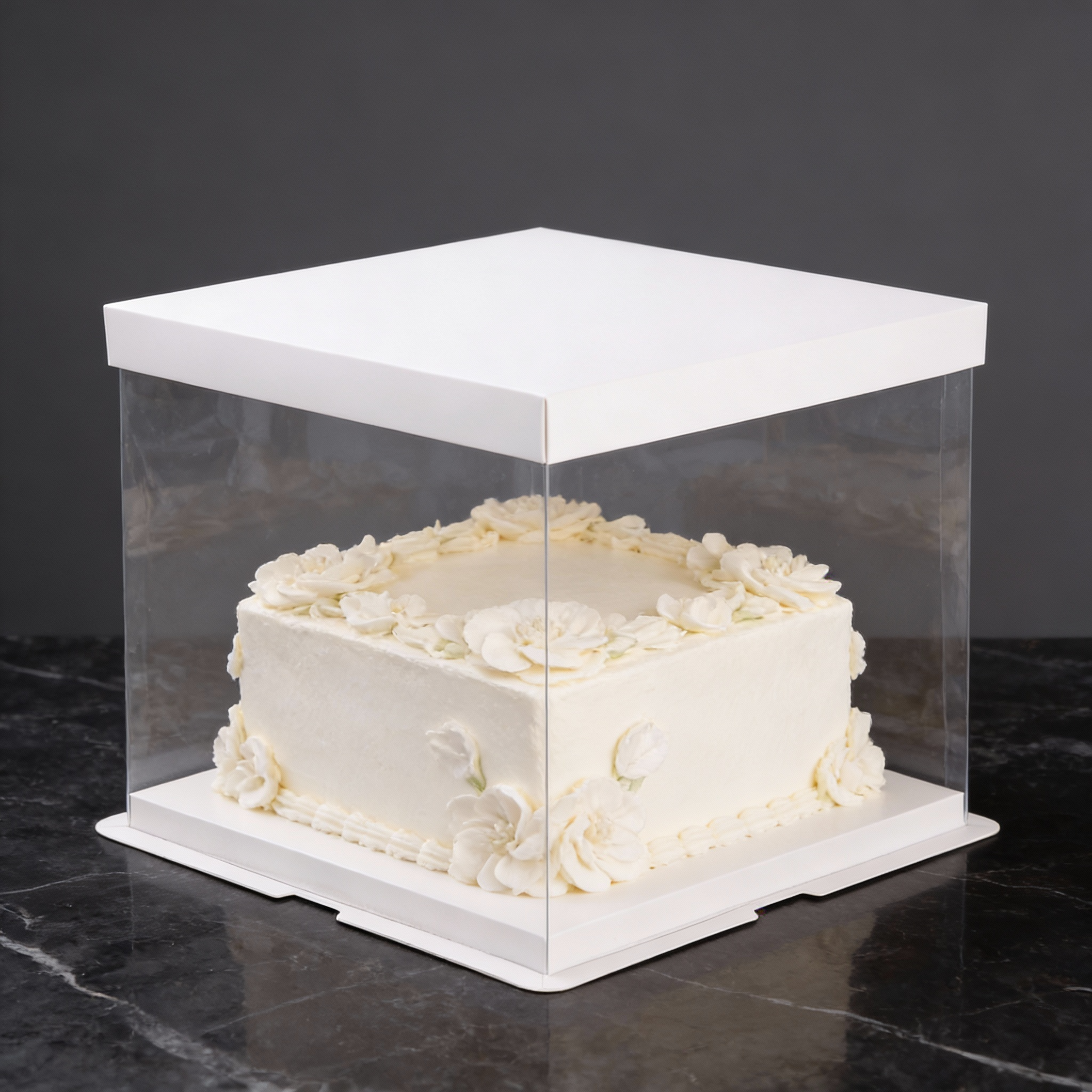 Коробка для хранения и транспортировки тортов с прозрачными стенками из плотного пластика.