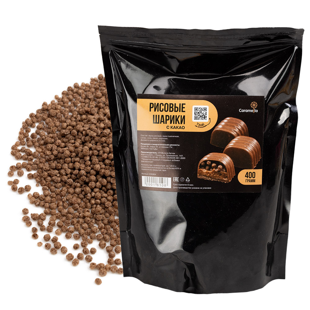 Рисовые шарики (воздушный рис) с какао используются как наполнитель для конфет и пирожных, а также могут использоваться как кондитерская посыпка.